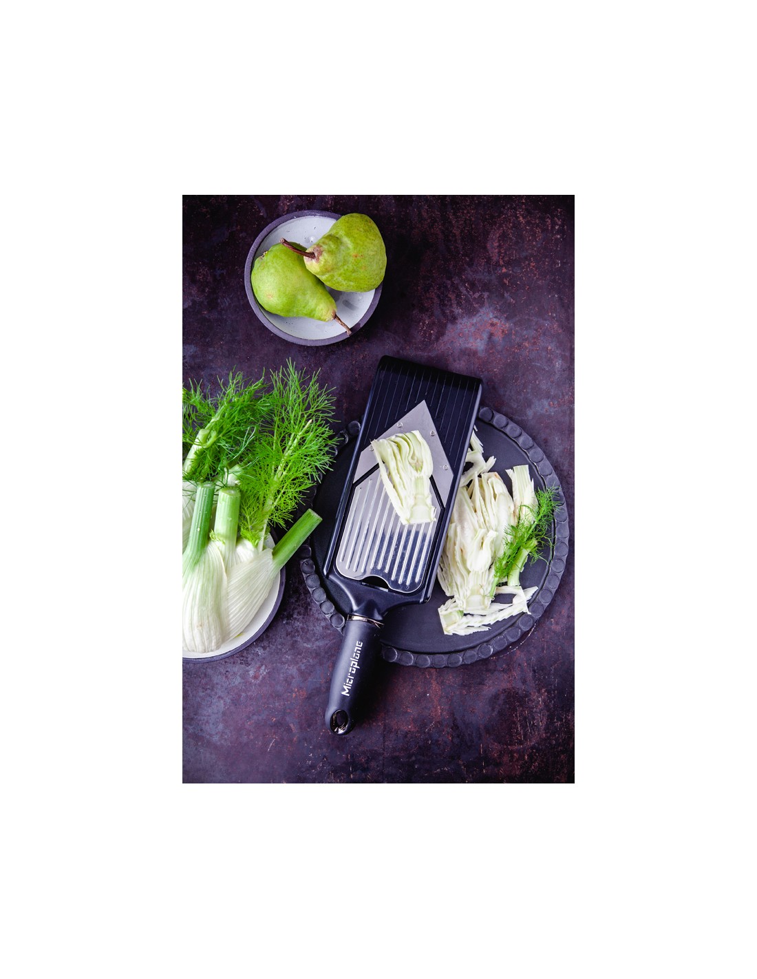 La lame est équipée de micro-dentelures de la lame permettant de couper plus facilement tous les fruits et légumes en tranches très fine.