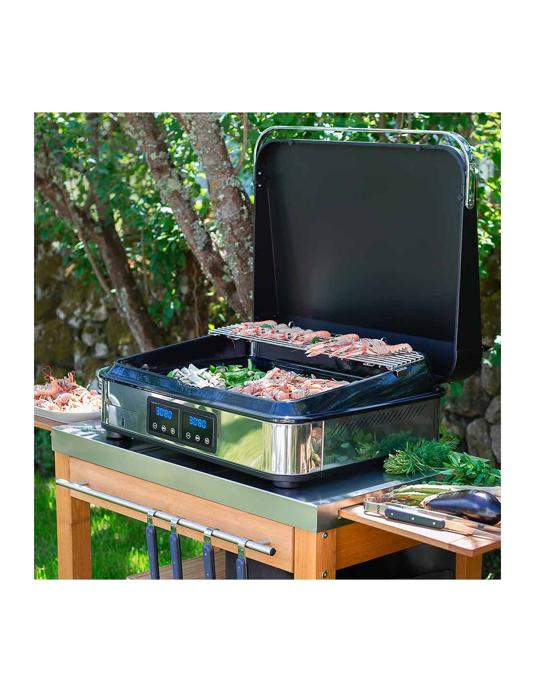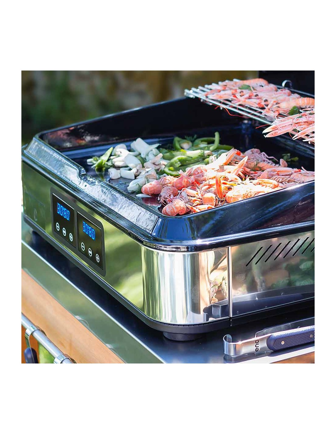 Pince en inox servant à travailler les aliments sur la plaque de la plancha ou la grille du barbecue.
